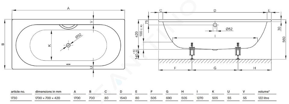Rechteckige Einbauwanne Starlet Abmessungen: 1700 x 700 x 420 mm... Vollständige Beschreibung anzeigen