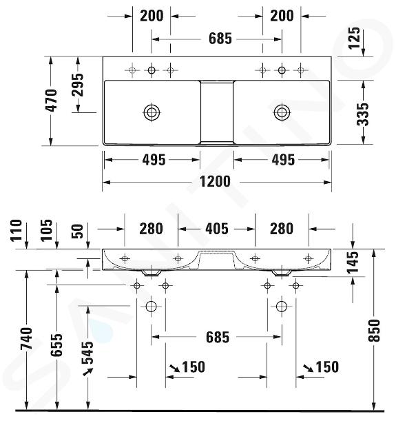 Wand-Doppelwaschtisch ohne Überlauf Abmessungen: 1200 x 470 x 145 mm... Vollständige Beschreibung anzeigen