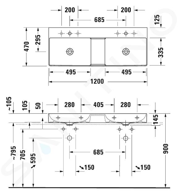 Doppelwaschtisch ohne Überlauf Abmessungen: 1200 x 470 x 145 mm... Vollständige Beschreibung anzeigen