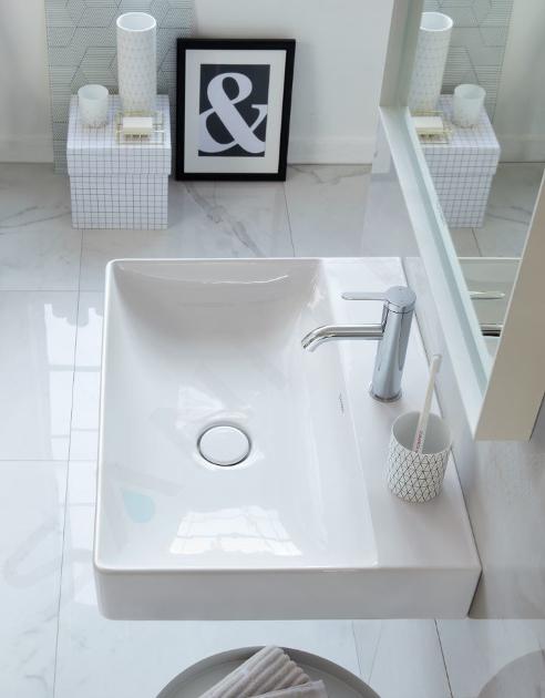 "Duravit Durasquare Waschtische haben makelloses Design, hervorragende Verarbeitung und Langlebigkeit. Die quadratische oder rechteckige Form zieht die Aufmerksamkeit auf sich und macht das Waschtisch zum dominierenden ästhetischen Element. Das dünne DuraCream-Material hat eine hohe Festigkeit und eine glänzende Oberfläche, an der Flecken nicht haften. Es gibt die Wandinstallation sowie die Möbelinstalation. Das Duravit DuraSquare-Programm bietet Ihnen mehrere Dutzend Produkte, aus denen Sie genau nach Ihren Anforderungen an Form, Abmessungen und Anzahl der Montagelöcher auswählen können."