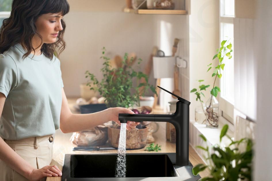 In der Hansgrohe Zesis M33-Reihe können Sie aus vielen Oberflächenbehandlungen wählen. Es gibt auch Armaturen, die unter das Fenster klappbar sind, mit herausziehbarer Brause oder für drucklose Wassererhitzer.