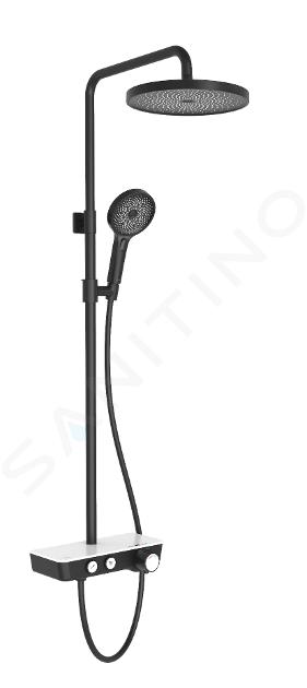In diesem Fall können Sie auch die Elemente des durchdachten Designs sehen, das auch sehr praktisch ist. Die Duscharmatur verfügt über eine Ablagefläche aus Sicherheitsglas, in der Sie Duschgel oder Shampoo aufbewahren können. Die Kombination des weißen Glases mit dem schwarzen Duschset sieht großartig aus.
