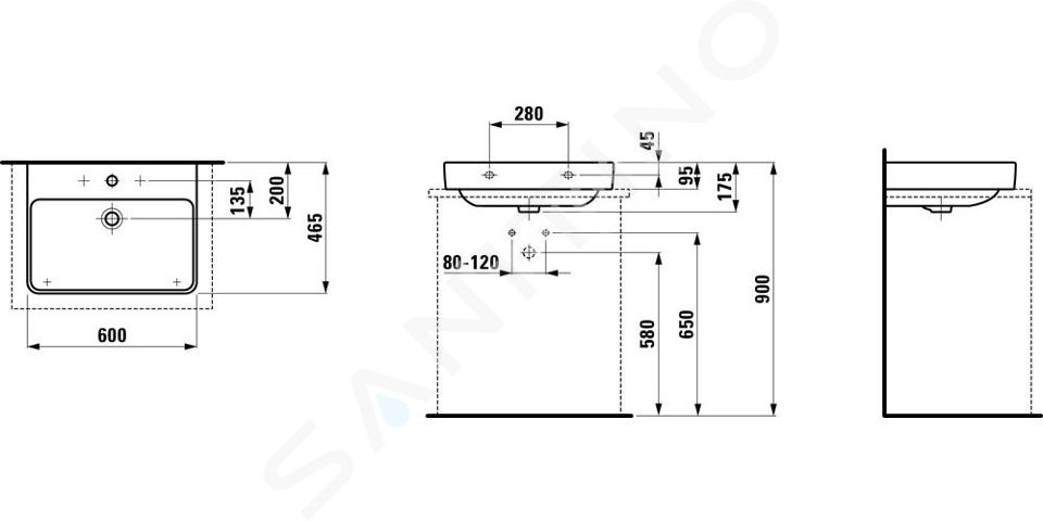 Waschtisch mit drei Hahnlöchern, mit Überlauf.