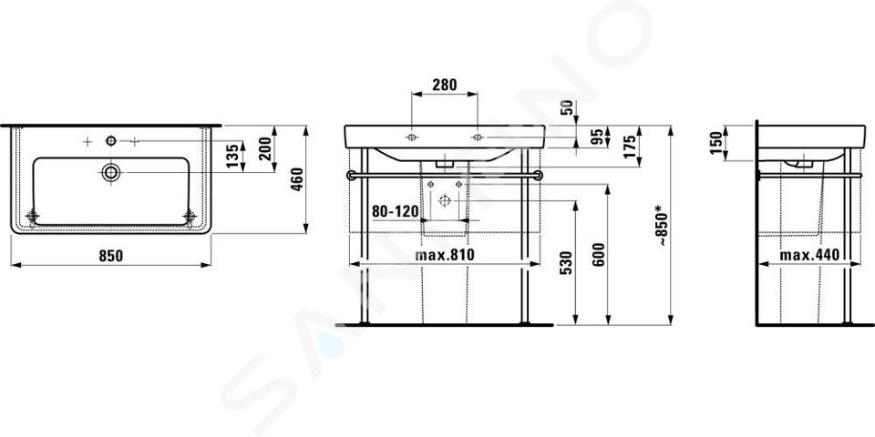Waschtisch mit drei Hahnlöchern, mit Überlauf Breite: 850 mm Tiefe:... Vollständige Beschreibung anzeigen