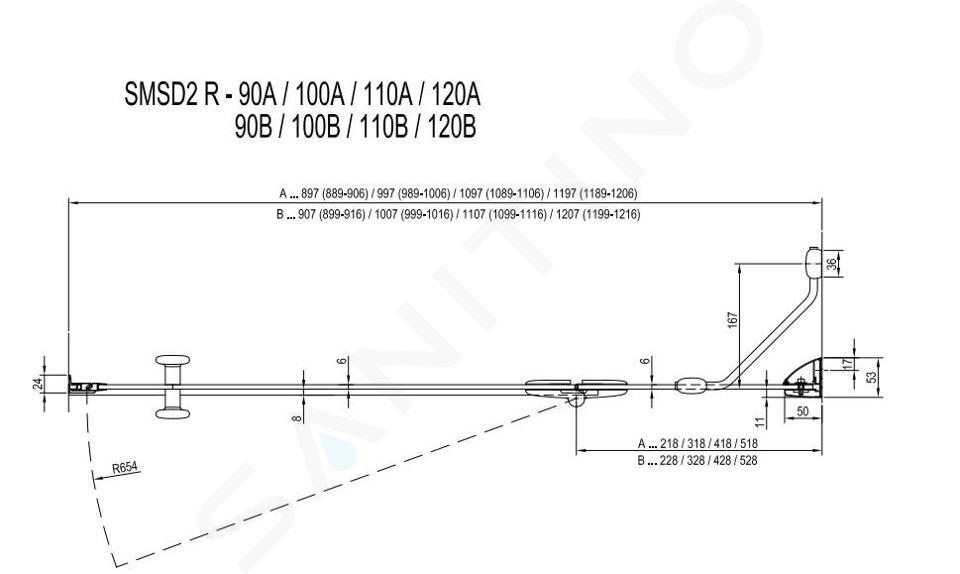 Die Smartline SMSD2 Duschtür ist in 2 Varianten erhältlich. Die Variante A ist für Bauöffnungen ausgelegt, die bis zu 11 mm kleiner sind als das Standardproduktmaß. Option B ist für eine Bauöffnung ausgelegt, die bis zu 16 mm größer ist als die Standardabmessung des Produkts. Für die Kombination mit einer Massivwand wählen Sie den Türtyp SMSD2 B.